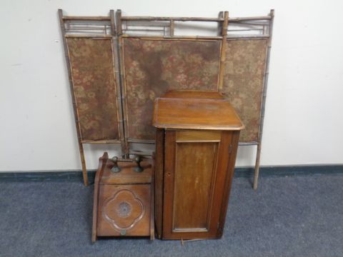 A Victorian mahogany pot cupboard together with an antique mahogany coal receiver and a bamboo three way folding screen.