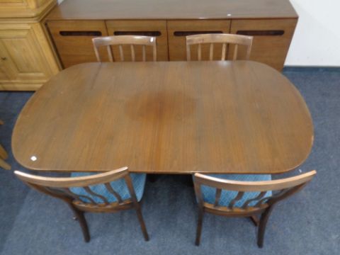 A 20th century teak six-piece dining room suite comprising extending dining room table, four chairs and low sideboard.