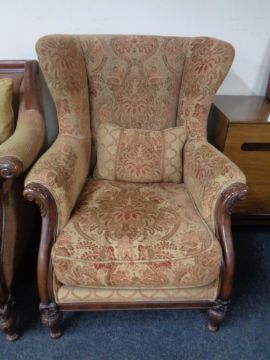 A Victorian style carved wooden frame settee with matching footstool upholstered in a two tone fabric, together with a matching wingback armchair in Paisley style fabric (3)