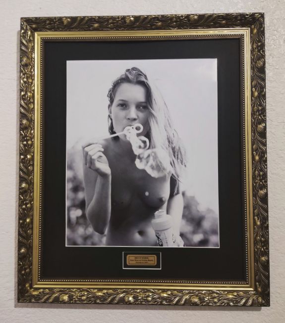 Photographer Bruce Weber photograph of model Kate Moss. Kate Moss blowing bubbles seductively on Golden beach, Florida, 1997. Mounted and framed with metal description plaque and photographers credit stamp on back. Size of print: 18.5 x 15 inches, overall size with frame: 27x24 inches, with some damage to the photo.