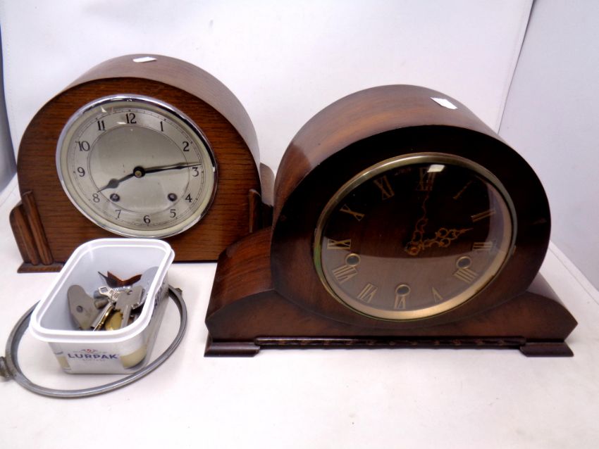 An oak cased 8 day mantel clock together with a further walnut cased mantel clock and a box containing assorted clock keys and pendulums.
