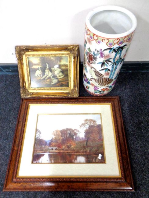 A Chinese style cylindrical stick pot together with a framed print of a spaniel with puppies in an ornate gilt frame and a further framed print.