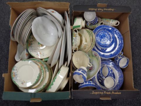 Two boxes containing antique and later dinnerware and tea china including willow pattern.