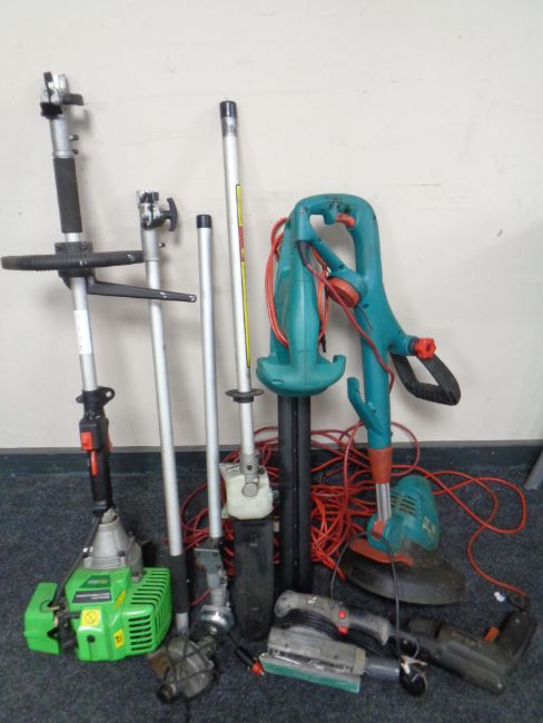 A crate containing a Florabest Petrol garden multi-tool together with a Bosch garden strimmer and hedge trimmer and other power tools.