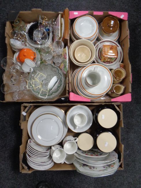 Three boxes containing assorted dinnerware, Royal Doulton Autumn Glory tea china, kitchen storage jars, drinking glasses, paperweights etc.