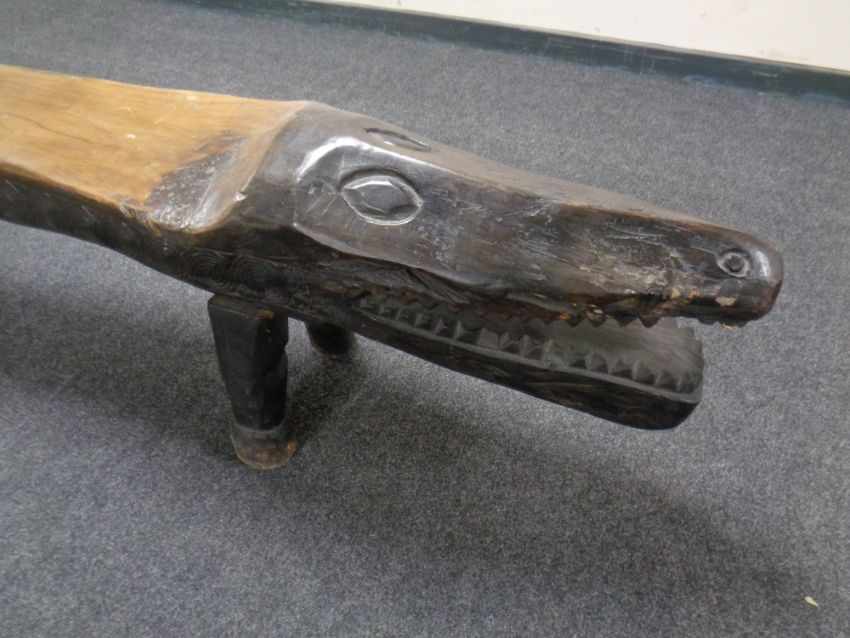 A carved hardwood bench in the form of a crocodile, length 260 cm