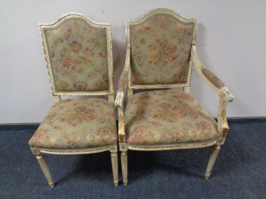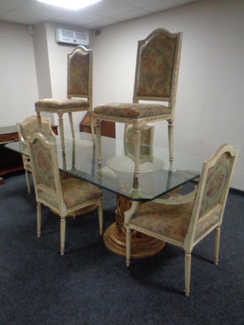 A contemporary Italian style glass-topped dining table on two cylindrical gilt pedestals together with a set of six cream and gilt dining chairs upholstered in a floral fabric, comprising two carves and four singles. (7)