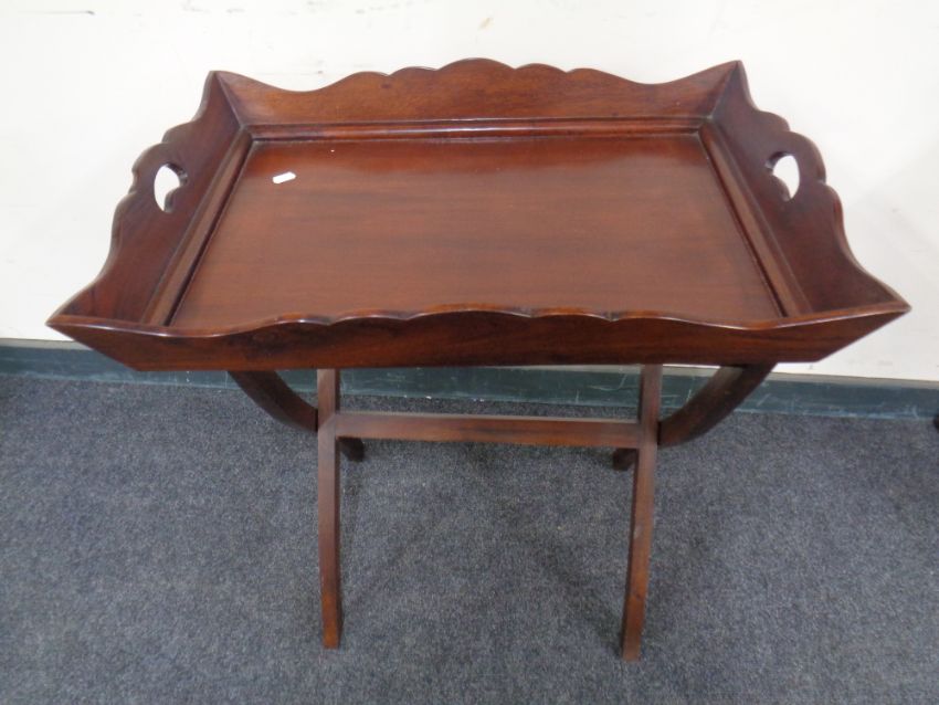 A mahogany butlers tray on stand.