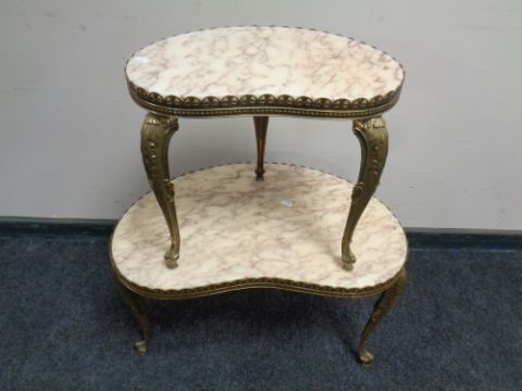 A nest of two brass and marble kidney shaped tables.