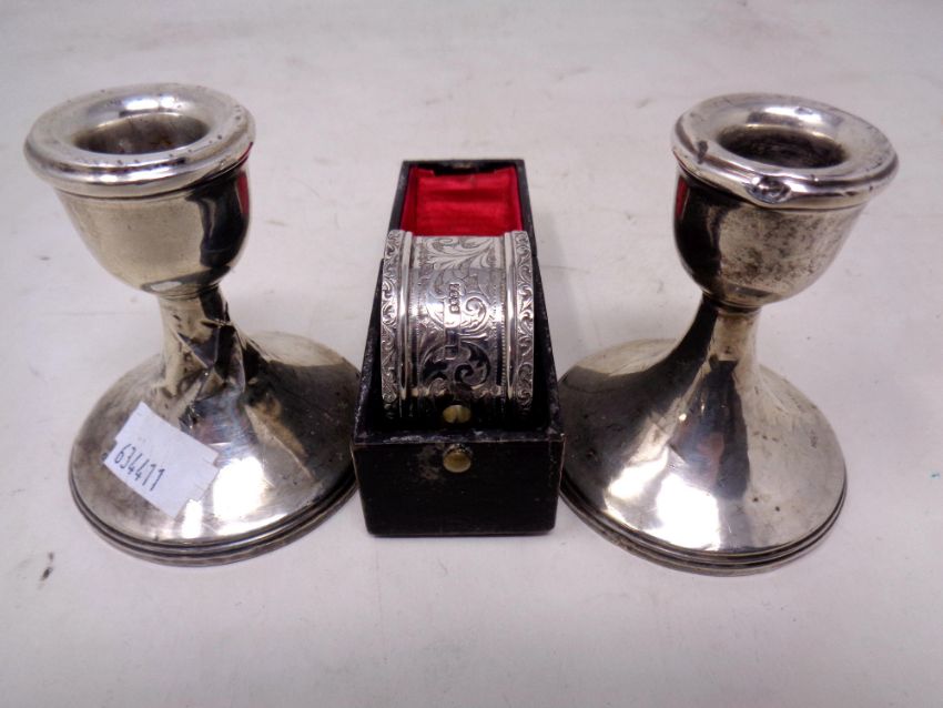 A pair of silver squat candlesticks (height 7cm, weighted) with a further silver napkin ring in case.
