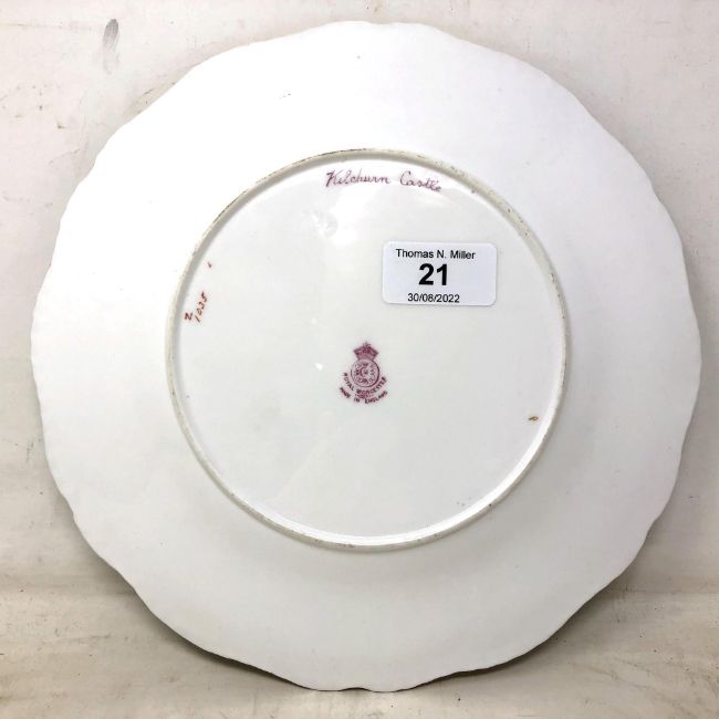 A Royal Worcester green, gilt and hand-painted cabinet plate, painted with a view of Kilchurn Castle by Harry Stinton, diameter 24cm.