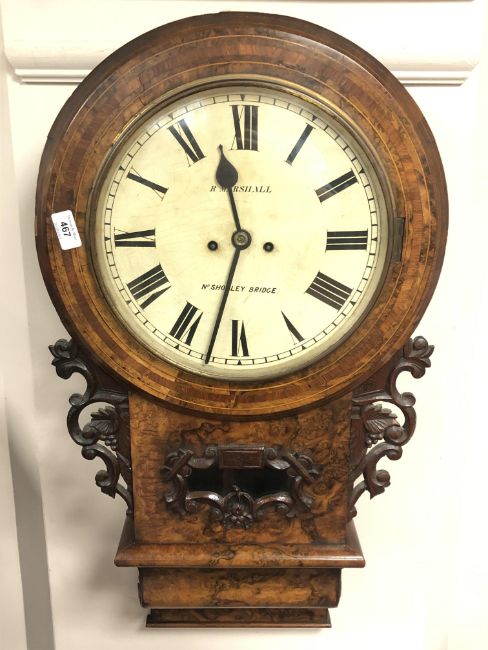 A 19th century inlaid walnut drop-dial wall clock with twin-fusee movement, painted 12" dial signed R Marshall, Nr. Shotley Bridge, striking on a gong, with pendulum and key.