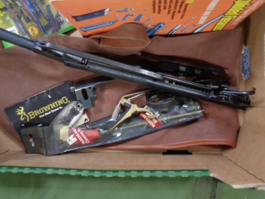 A box containing Sabre gun bag together with a further gun bag, air rifle parts including barrel and silencer, gun books etc.