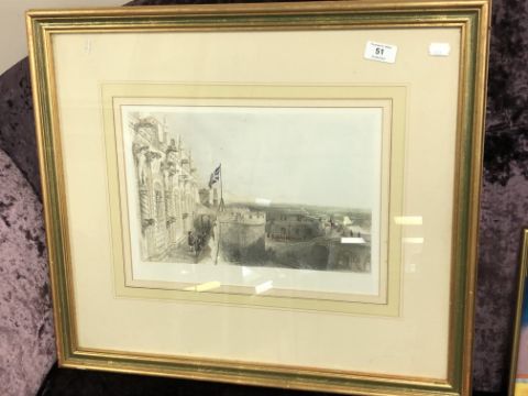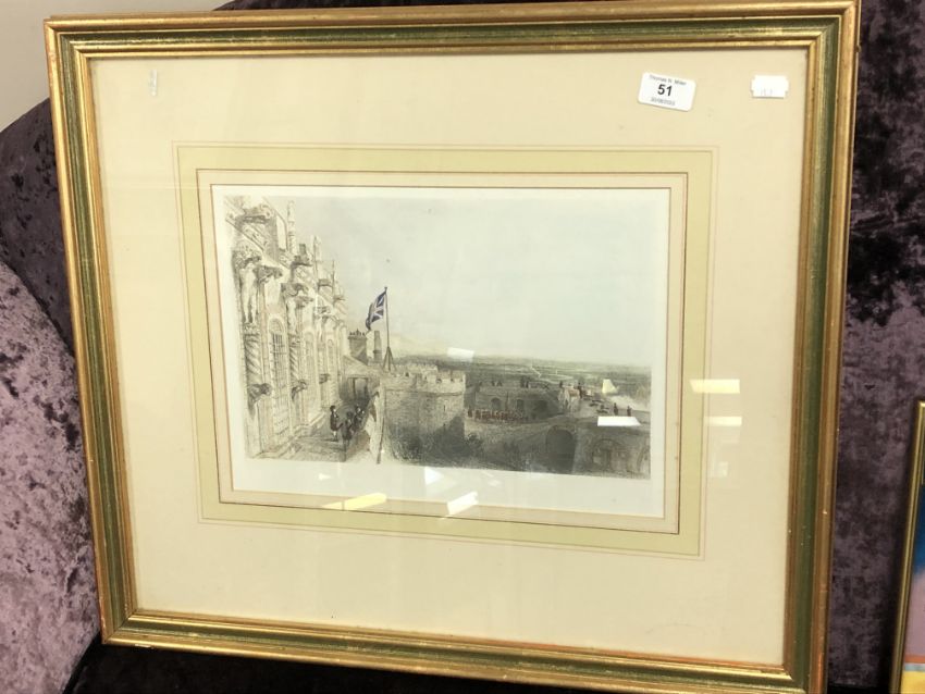 A hand coloured engraving depicting a castle, 36cm x 26cm
