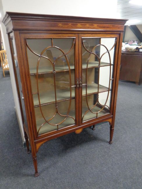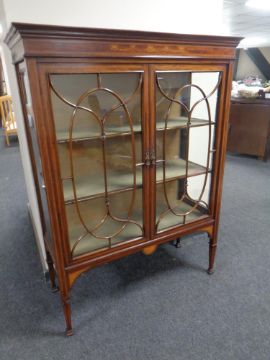 A 19th century inlaid mahogany double door display cabinet on raised legs.