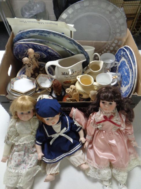 Two boxes containing assorted collectors dolls, whisky jugs, blue and white meat plates, ornaments etc.