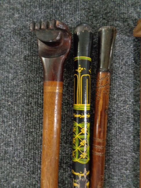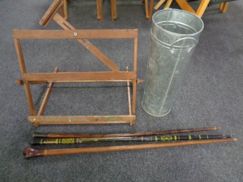 A folding wooden artists easel together with a metal stick pot containing three walking sticks.