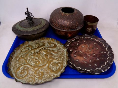 A tray containing five pieces of antique and later brass and copper ware including a Chinese brush pot, two scalloped edge trays, vase etc.