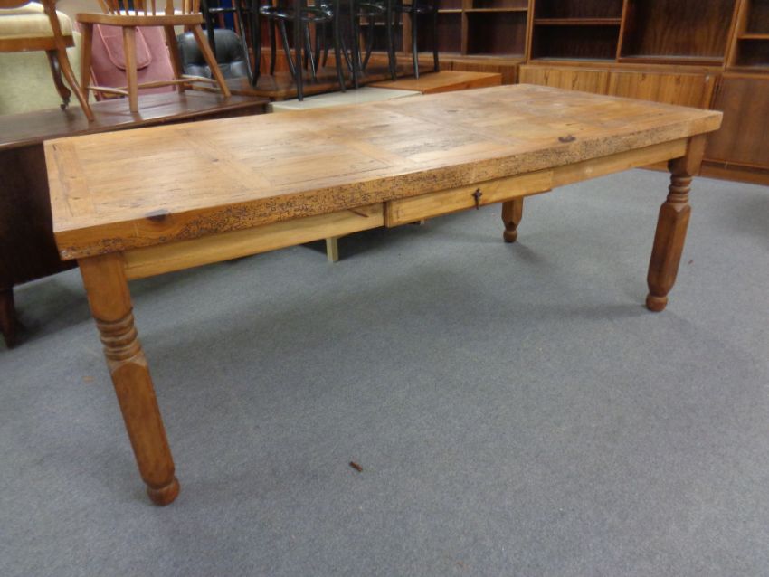 A rustic pine farmhouse style table with a fitted drawer and a set of six rush seated dining chairs