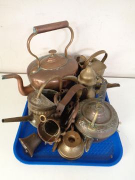 A tray containing antique and later copper and brass ware including kettles, eastern teapots, watering can, doorbell etc.