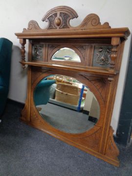 An Edwardian oak fire surround together with a similar Arts & Crafts overmantel mirror with inset copper panels (2)