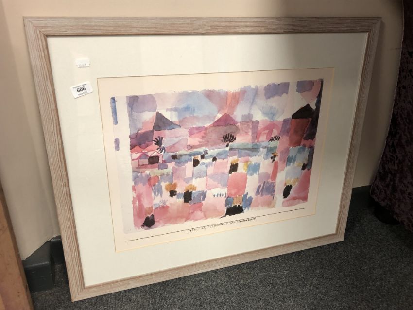 A continental colour print depicting abstract buildings, 54 cm x 40 cm