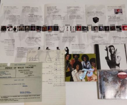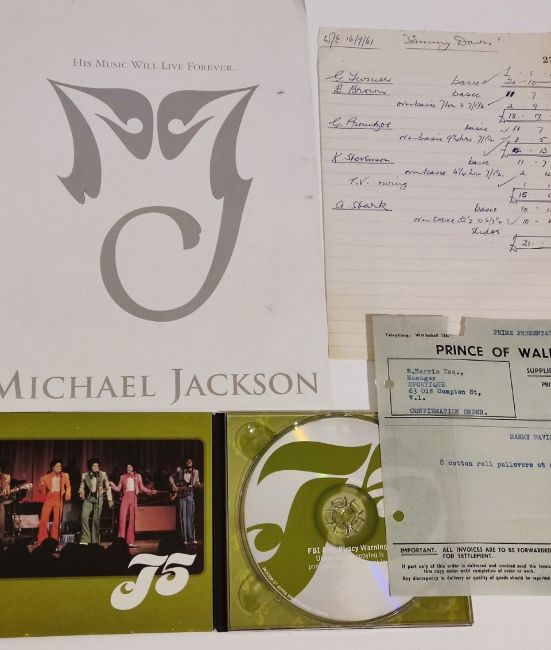 Jackson 5, Prince, Sammy Davis jnr CDs. Rare hard to find Jackson 5 albums 'Joyful Jukebox music (1976)', and 'Boogie (1979)' taken from unreleased songs from Motown, Michael Jackson Japanese promotional catalogue, Prince 'Parade' and 'Chaos and disorder' albums. Vintage 1961 'Prince of Wales theatre' clothes invoices for 'The Sammy Davis show'.