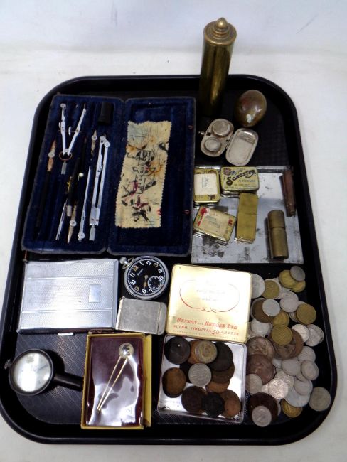A tray containing a gramophone needle tins, assorted coinage, cased drawing instruments, cigarette case, trench art pot and lighter.