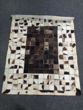 A cowhide patchwork rug.