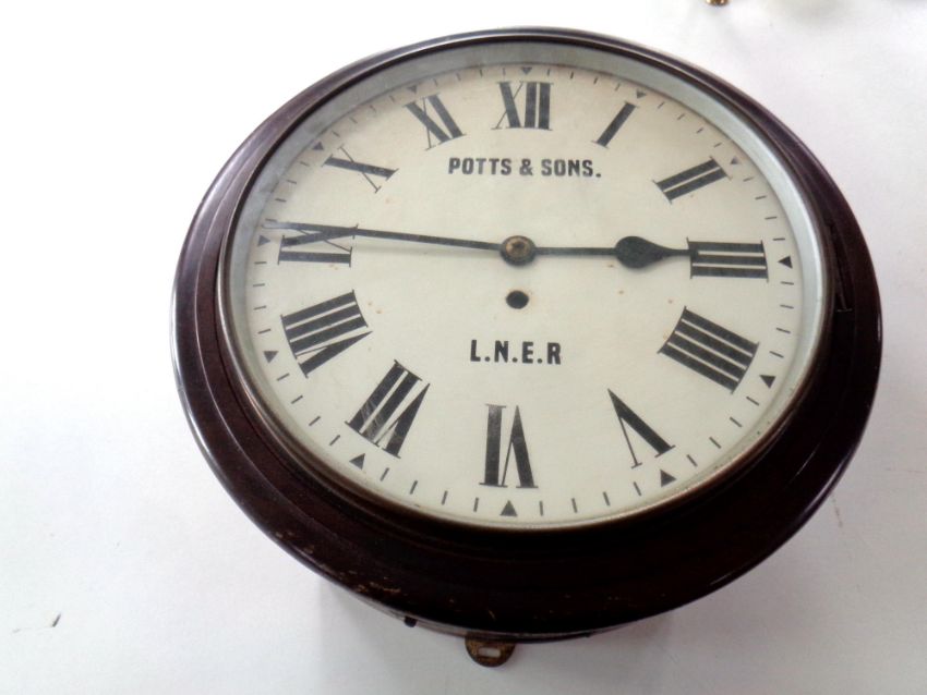 An early 20th century circular station wall timepiece with enamel dial, signed Potts & Sons LNER, with chain driven single fusee movement, with pendulum and key