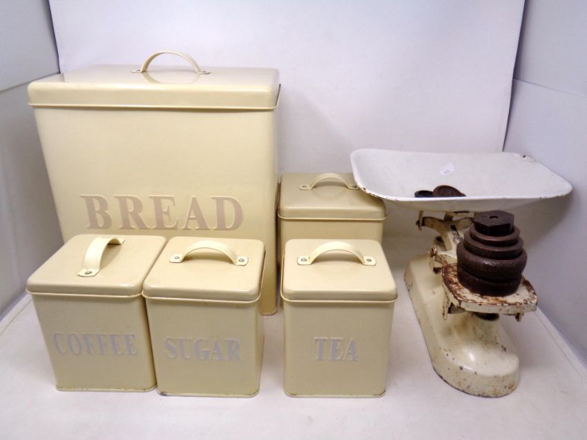 A set of vintage kitchen scales with weights together with a contemporary five piece kitchen bread bin and canister set