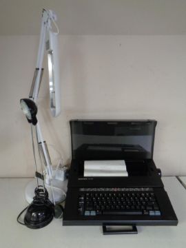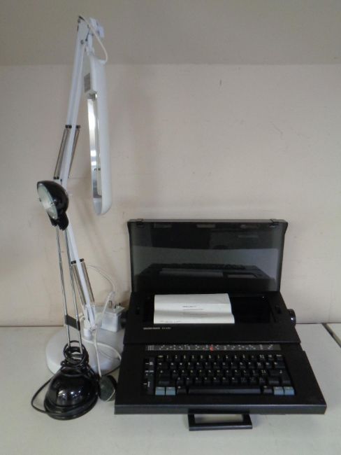 A Silver Reed EX43N electric typewriter in case together with two desk lamps.