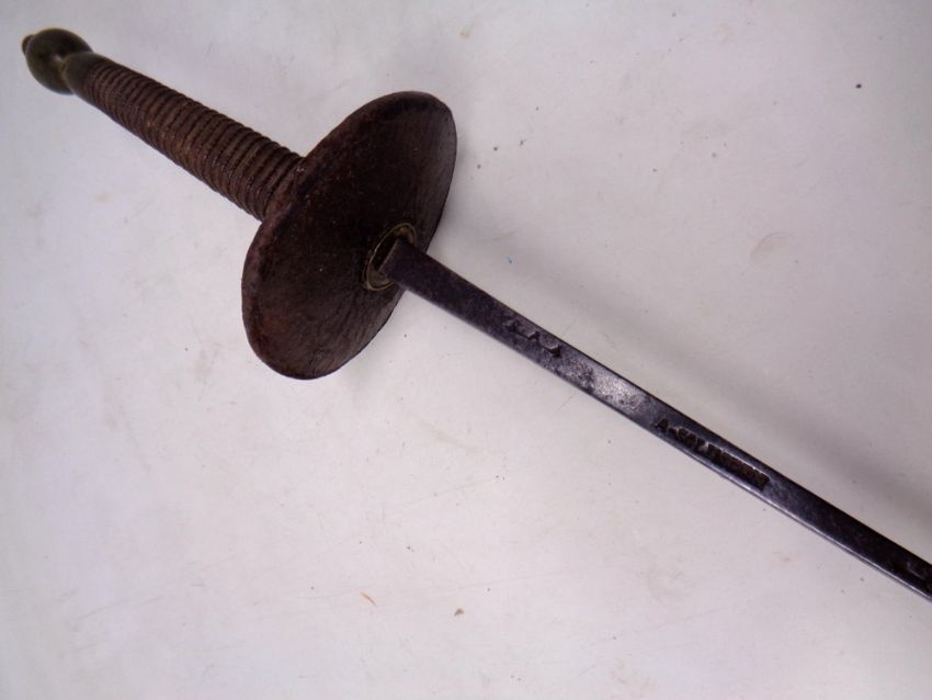 A fencing epée marked A-Solingen with a tooled leather hand guard.