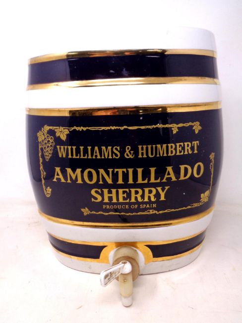 A china lidded sherry barrel with tap. Amontillado sherry produce of Spain.