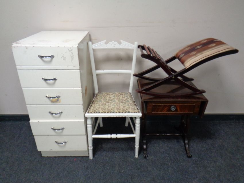A mid-20th century painted six drawer chest together with a painted Edwardian bedroom chair, a gout stool and a sofa table.