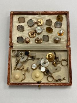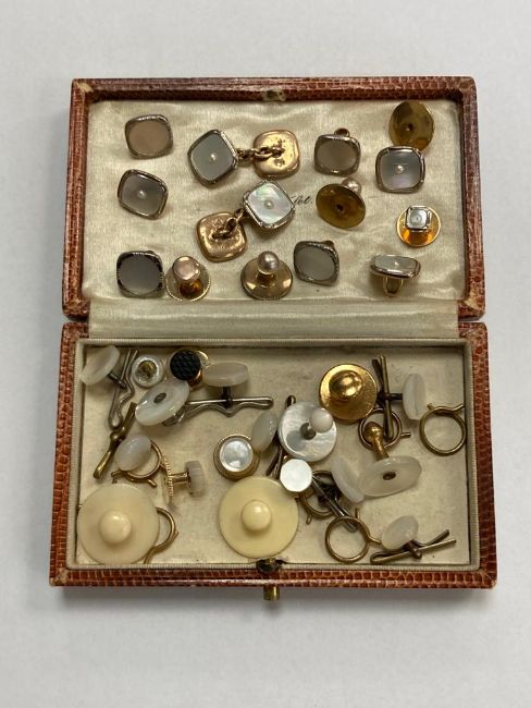 A box of vintage Gentleman's studs including examples in 9ct yellow and white gold with mother of pearl, cufflinks etc