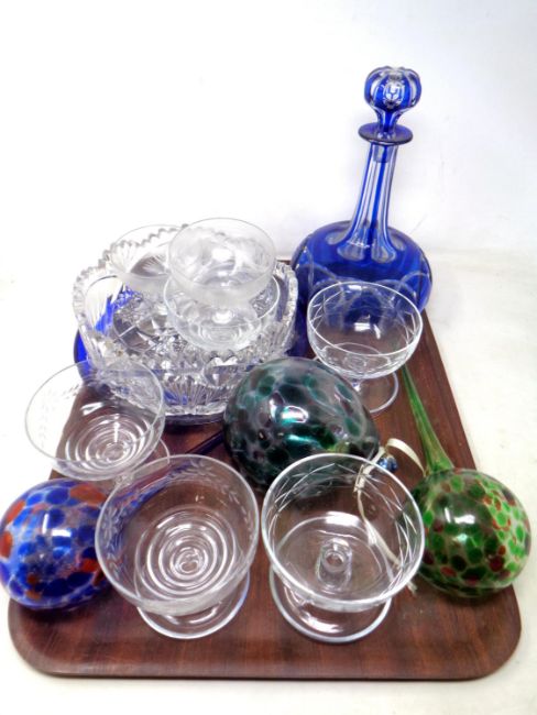 A tray containing assorted glassware including a Bohemian crystal two-tone decanter, glass bauble, dessert dishes etc.
