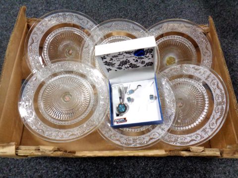 A box of pressed glass dishes together with a lady's costume wristwatch, pendant and earring set.