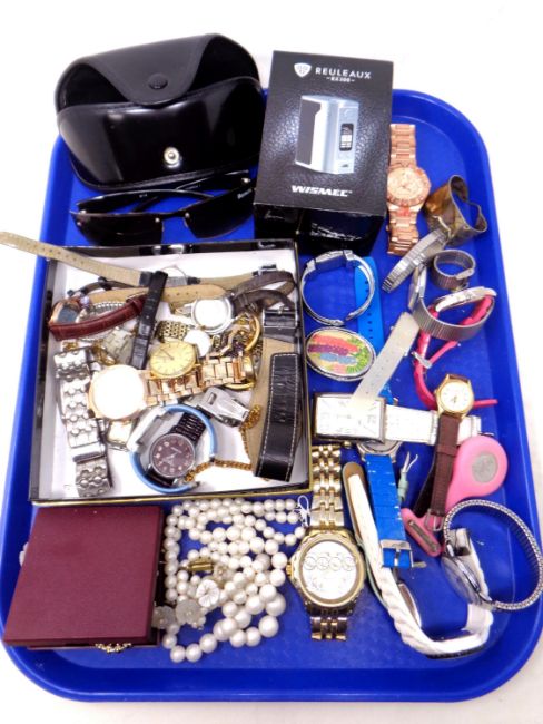 A tray containing Bench sunglasses, assorted lady's and gent's wristwatches, costume jewellery, boxed Reuleaux RX300.