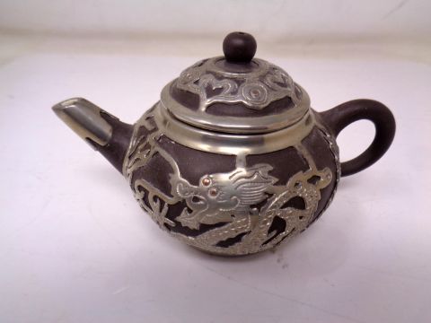 A Chinese stoneware and white metal mounted teapot (height 7cm).