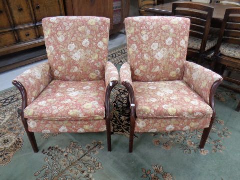 A pair of Parker Knoll fireside armchairs upholstered in floral fabric.