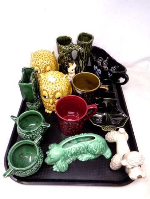 A tray of Sylvac china, a ceramic toast rack, mugs, animal figures etc.