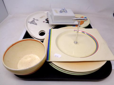 A tray containing Shelley butter dish and cover, Royal Staffordshire Crocus by Clarice Cliff side plates, cake platter etc.