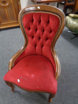 A Victorian style lady's chair upholstered in red button dralon.