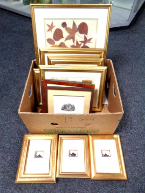 A box of various gilt framed decorative pictures and prints, Egyptian prints etc.