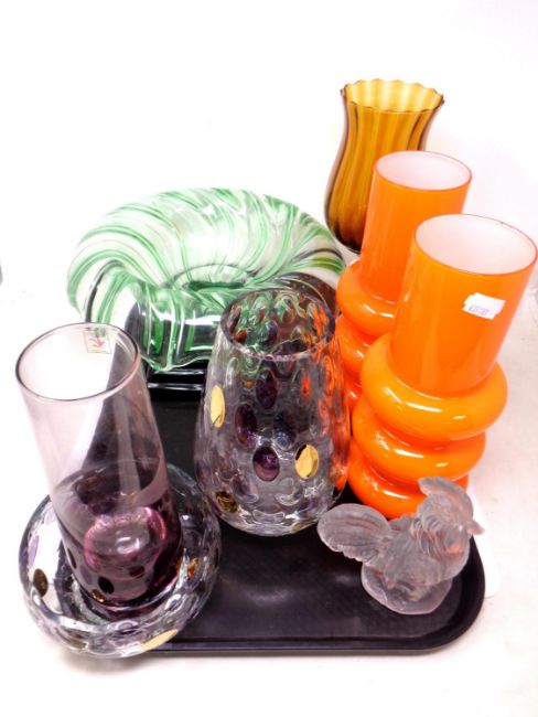 A tray containing 1970's orange glass vases together with further coloured glassware including a fruit bowl, etched vase etc.