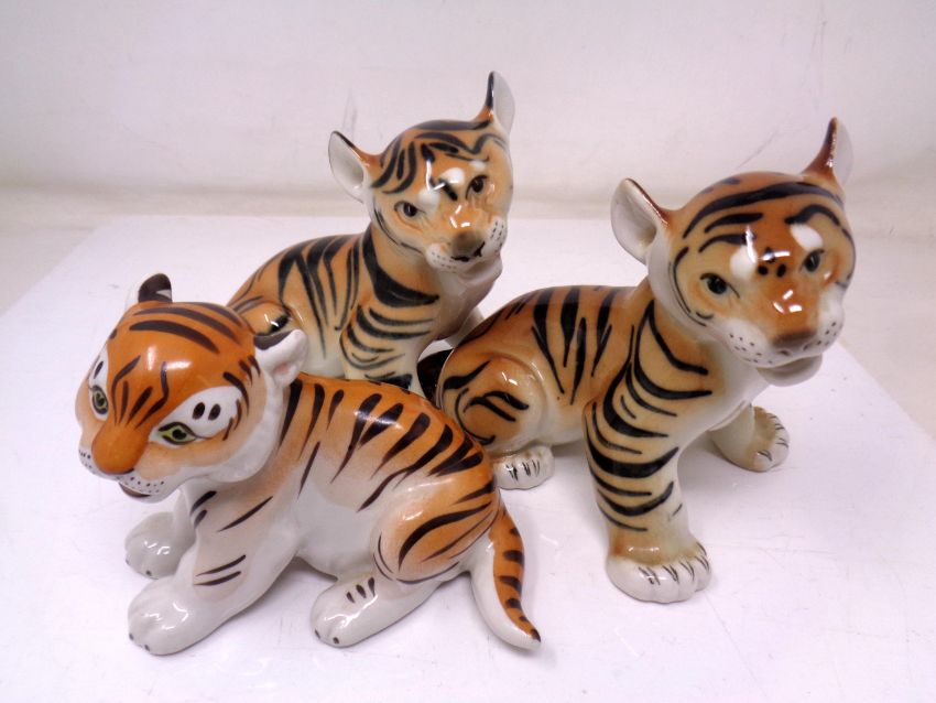 A set of three USSR china tiger figures (tallest 12.5cm).