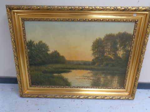 Continental school : Pond with woods beyond, oil-on-canvas, indistinctly signed, in decorative gilt frame.