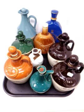 A tray of mainly empty whiskey decanters including Ballantine's scotch whiskey, Munro's King of Kings, Bonnie Prince Charlie etc.