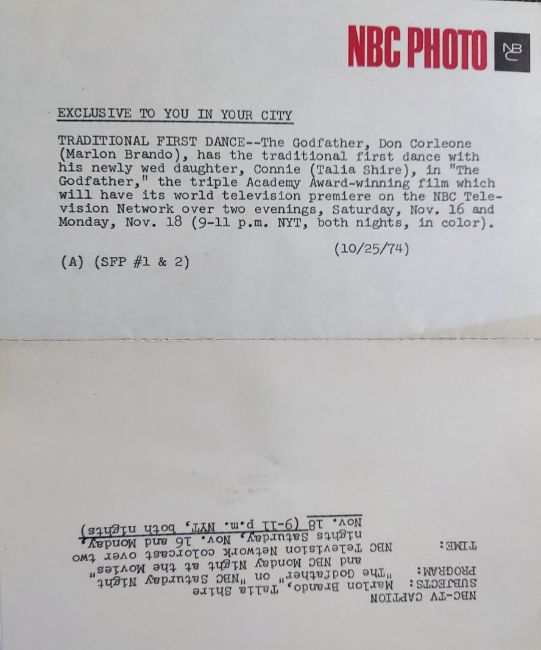 Vintage 1974 NBC photo of Marlon Brando in the film 'The Godfather' having the traditional first dance with on-screen daughter Talia Shire.